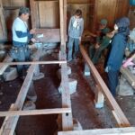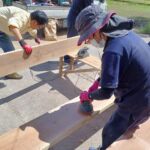 差し鴨居・足場板・床の塗装を実践、前準備として、養生・埃取り・やすりがけ等も学びました。