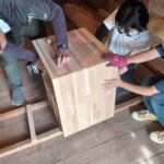 差し鴨居・足場板・床の塗装を実践、前準備として、養生・埃取り・やすりがけ等も学びました。